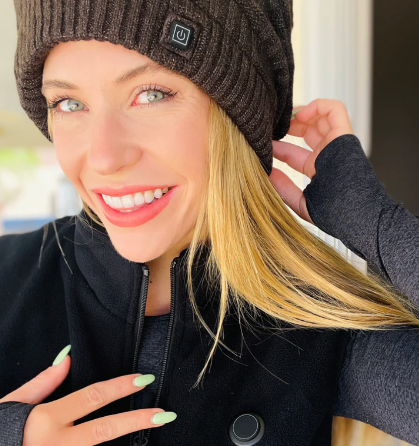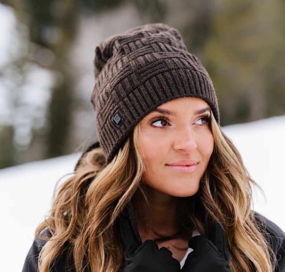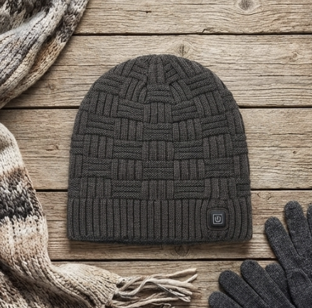 The beanie contains built-in heating elements powered by a rechargeable battery pack. Simply press the button to cycle through heat settings and enjoy warmth on demand.